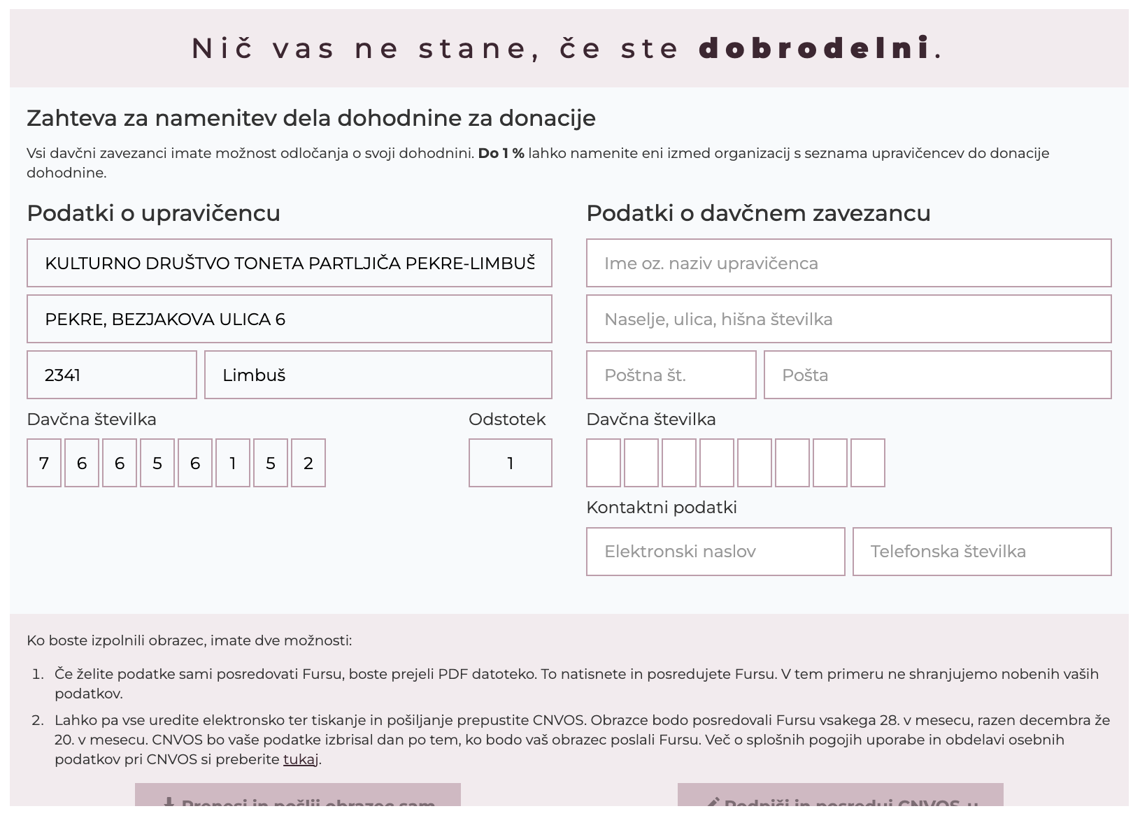 Podprite nas z donacijo 1 % dohodnine! Donacija vas nič ne stane, saj gre za del dohodnine, ki bi sicer ostal v državnem proračunu.